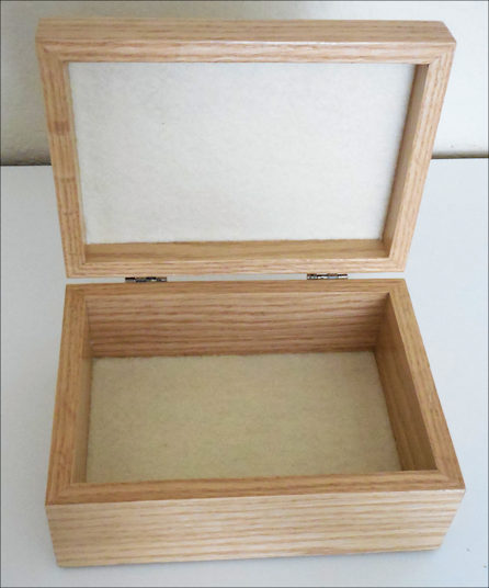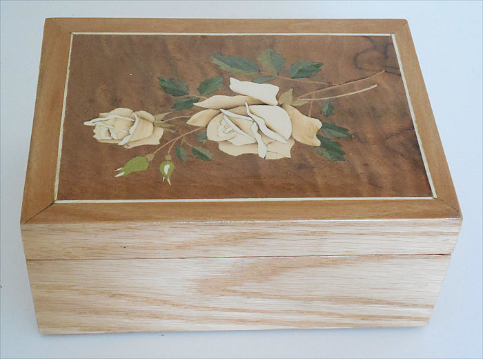 The sand shaded white rose(s), of holy and sycamore with dyed green leaves are set into a Walnut Burl. The inside top and bottom have a dark brown felt fitted insert. Although created for a friend, a mistake in my vacuum pressing the top now classifies this as a reject. (we'll keep it). The miters on the holy and red oak corners are terrible. :-) It has 5 coats of sanding sealer sanded to 1500 grit and 2 coats of wipe-on polyurethane gloss varnish. It was finished with a polish using Renaissance Wax. |