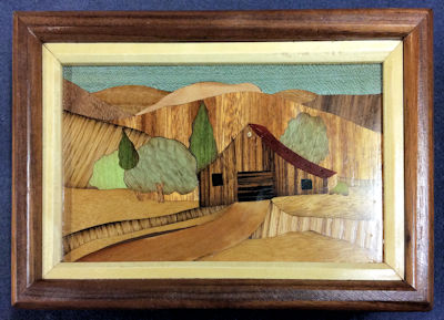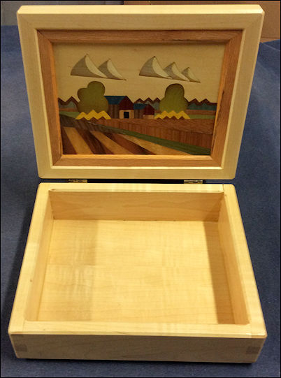 The covered bridge scene box is in maple. It measures 9 X 7.5 X 3.75 inches. The floor of the box is curly maple. The moldings are rosewood and oak. |