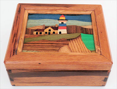 The Lighthouses. Wisconsin's maritime history. It measures 7-1/4 x 6-1/4 x 3-1/4 inches. Made of Tiger wood, the floor is paper backed white oak on a hard board. |