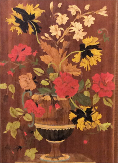 as presented at our Spring 2016 woodworker's show in Green Bay, Wisconsin. Bob Hi Bob, These look terrific. You are very good at Marquetry. Keep up the good work and thanks for the close-ups below. Ernie Below left: One of Bob's Birds in close-up. Below: Bob says, "ambitious copy of a traditional still life scene. It is done on a wide piece of cherry veneer and measures nearly 20 X 14 inches without the frame. |