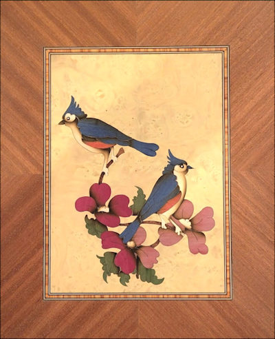 Titmice Sitting on Pink Dogwood picture is 13" x 10" and cut with Scroll Saw. Finished with Endo-Var |