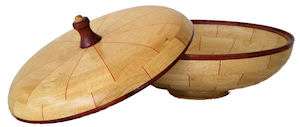 The Bowl top left is African Jacaranda with orange dyed veneer. It is trimmed