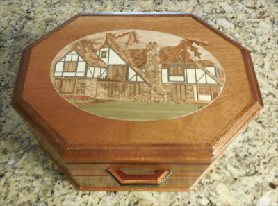 This is the finished Jewelry box. The Marquetry picture was made by Ernie Mills. |
