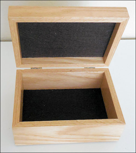 Red Oak Trinket Box #1 ~ This was created for a very good friend of ours ~ The sand shaded white rose, of holy and sycamore with dyed green leaves are set into a Walnut Burl. It sports a two strip Mahogany-Holy band and an outer border of matching Red Oak veneer. The inside top and bottom have a beige felt fitted insert. Fitted later was a 1/8" diameter earth magnet acting as a 'lock'. |
