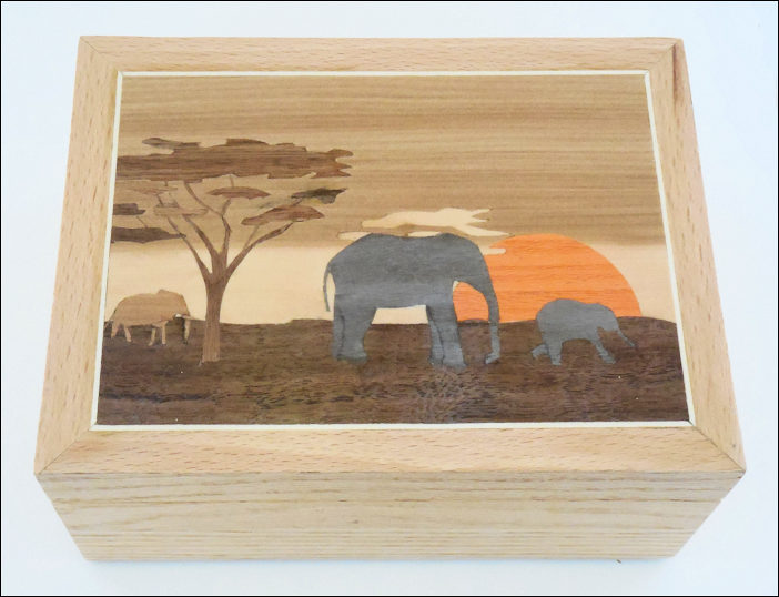 Elephant. Titled African-Savanna Elephants at Dawn. It has a single Holy band with an outer border of Red Oak Veneer to match the box. The inside top and bottom have an 'Walnut Brown' fitted felt. I don't like this particular felt since it shows the TiteBond glue through the felt. (maybe use a white glue instead eh?) It has 5 coats of sanding sealer sanded to 1500 grit and 2 coats of wipe-on polyurethane gloss varnish. It was finished with a polish using Renaissance Wax. |