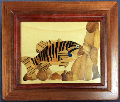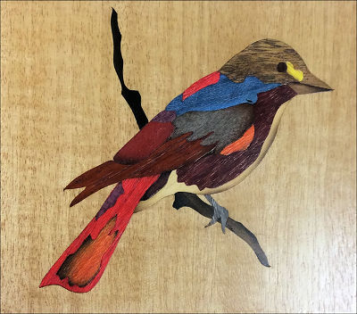as presented at our Spring 2016 woodworker's show in Green Bay, Wisconsin. Bob Hi Bob, These look terrific. You are very good at Marquetry. Keep up the good work and thanks for the close-ups below. Ernie Below left: One of Bob's Birds in close-up. Below: Bob says, "ambitious copy of a traditional still life scene. It is done on a wide piece of cherry veneer and measures nearly 20 X 14 inches without the frame. |