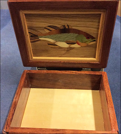The Fish box is done in Bubinga. It measures 9 X 7 X 3.75 inches. The floor is maple. The moldings are Padouk and oak. |