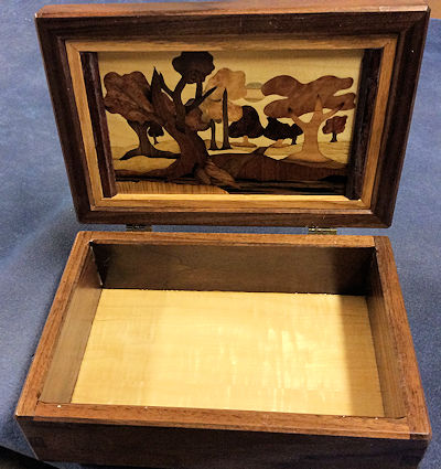 box justice. This box is perfectly made and much expertise was used in its construction. It sports dovetail joints, two different Marquetry pieces, two ornate, perfectly fitted hinges and the selection of Veneers is excellent. The finish on the box is remarkable, nicely sanded and varnished. Again Bob many thanks. |