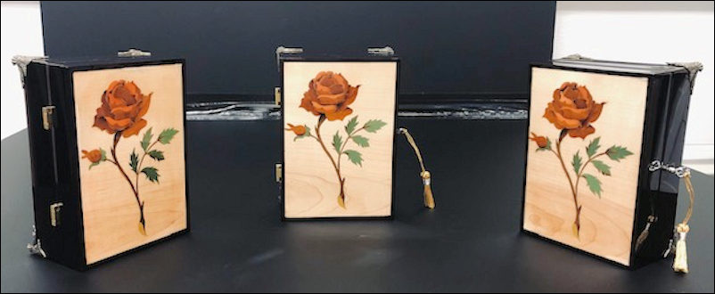 Rose Trinket Box This matched set of Trinket Boxes are well thought out and exquisit. The Marquetry Roses are beautifully made. Box construction is absolutely first class, sporting corner feet and high quality hinges. Each box is lockable with very thoughtful key tassels. Lovely and very pleasing to the eye. |