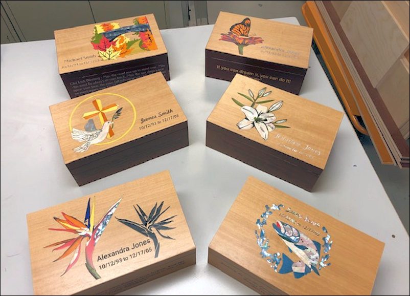 Experimental Funerary Urns. Notice the art motif chosen wisely to complement the Persons true life passion. A great touch. |