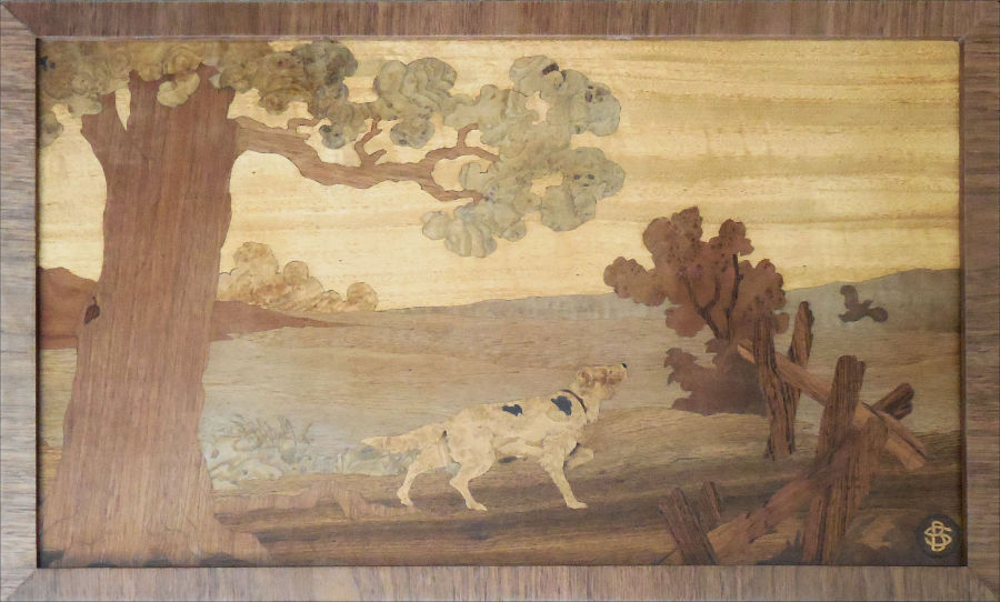 leaves as a grey whitish area in the foreground. The light spots in the sky just underneath the mold luckily turned out to be superficial and not the substrate showing through as I at first thought. This was cleaned up with scrapping. The scratches on the tree trunk and numerous other places needed a bit of sanding to remove them but that turned out fine. The Frame was in really bad condition and was thrown away although I did return it to the owner. The client wanted a similar cross wise veneer as the original so I improvised with a piece of 3/4" corner molding. This was by far the most time consuming part of this reconstruction. Covering the Corner molding with the Walnut Veneer was a real learning curve. It turns out that even using a scalpel to cut the pieces you had to make sure the enter or top edge of the cut was the one that was displayed because where the knife came out there were tiny flakes coming off that were extremely noticeable. If we had been cutting with the grain this frame would have been finished much earlier. I actually had to take the veneer off the corner molding frame twice before I eventually had a surface that I liked. The veneer was adhered using contact cement. Although difficult and leaving a bad surface to refinish I think it might have been easier than if I had used Titebond ll. Maybe not! Anyway the frame was finished, after 4 coats of sanding sealer and later a couple of coats of Gloss Polyurethane, I put it away for a rest. :-) I then sanded the back up to 600 grit. Applied 5 coats of sanding sealer and after it dried thoroughly I applied two coats of Gloss Polyurethane. Two days later having sanded the front picture also to 600 grit I put 4 coats of sanding sealer and two coats of Satin Polyurethane. This was put aside to dry hard. The Frame and Picture where glued using Titebond ll but I needed to clamp all four corners because the picture was somewhat bowed along the length. After a day setting it turned out that we got lucky yet again and the frame must have corrected the bow. The piece now looks great. We decided to use Gloss on the back and frame but Satin on the picture to stop, what I call the Disney affect. It worked. The whole picture, which is hanging on my wall at present looks very good. Having entered Marquetry pieces in the National Contests in England I soon learned that a good, clean looking hanger at the back is essential. Please check the back view on the restoration web page. See link below. If you try restoration please remember that you are NOT creating this piece of marquetry and whatever amount of work you put into it the end product will only be as good as the Original Artists skill. My thoughts? I am pleased with the results although the marquetry technique of the original is not mine. The amount of detail that was hidden or not easy to see has come out and the whole picture lives again. |